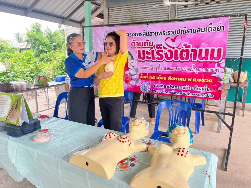 รายละเอียด : โครงการสืบสานพระราชปณิธานสมเด็จย่า ต้านภัยมะเร็งเต้านม บ้านทันสมัย ม.3 ต.หนองปลิง อ. นิคมน้ำอูน จ. สกลนคร วัตถุประสงค์ของโครงการ 1. เพื่อสืบสานพระราชปณิธานสมเด็จย่าที่ต้องการให้หญิงไทยพ้นภัยมะเร็งเต้านม 2. เพื่อส่งเสริมให้สตรีมีความรู้ ตรวจมะเร็งเต้านมด้วยตนเองอย่างสม่ำเสมอถูกวิธี 3. เพื่อขยายระบบบริการคัดกรองมะเร็งเต้านมด้วยตนเองให้ทั่วถึง